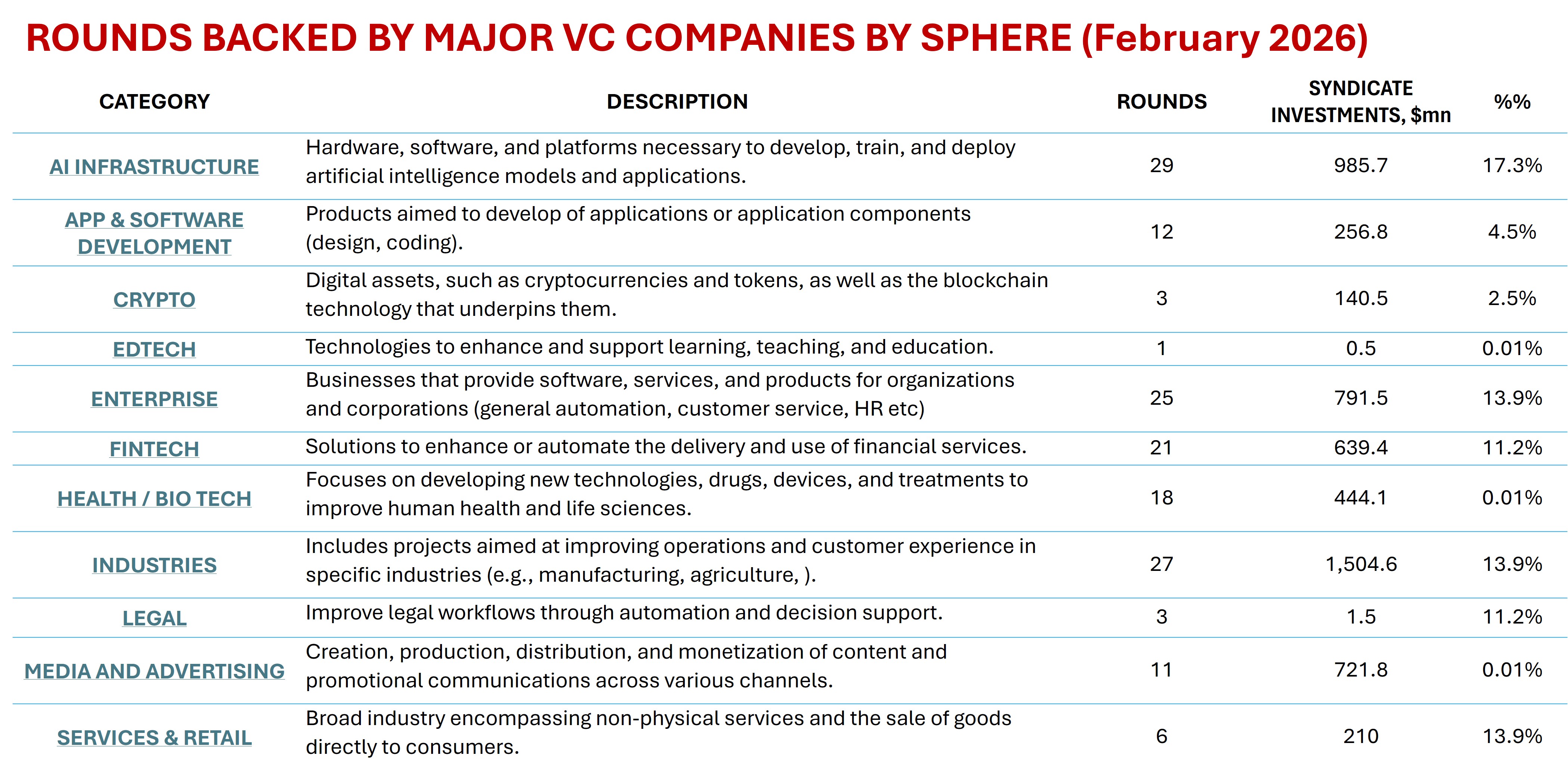 The report based on 158 deals concluded or announced with the participation of these companies in February 2026— approximately 4.9% of the total number of venture investments for the month. 114 deals from 158 were leaded by this 13 venture firms, in other 44 deals, the firms participated in syndicates.